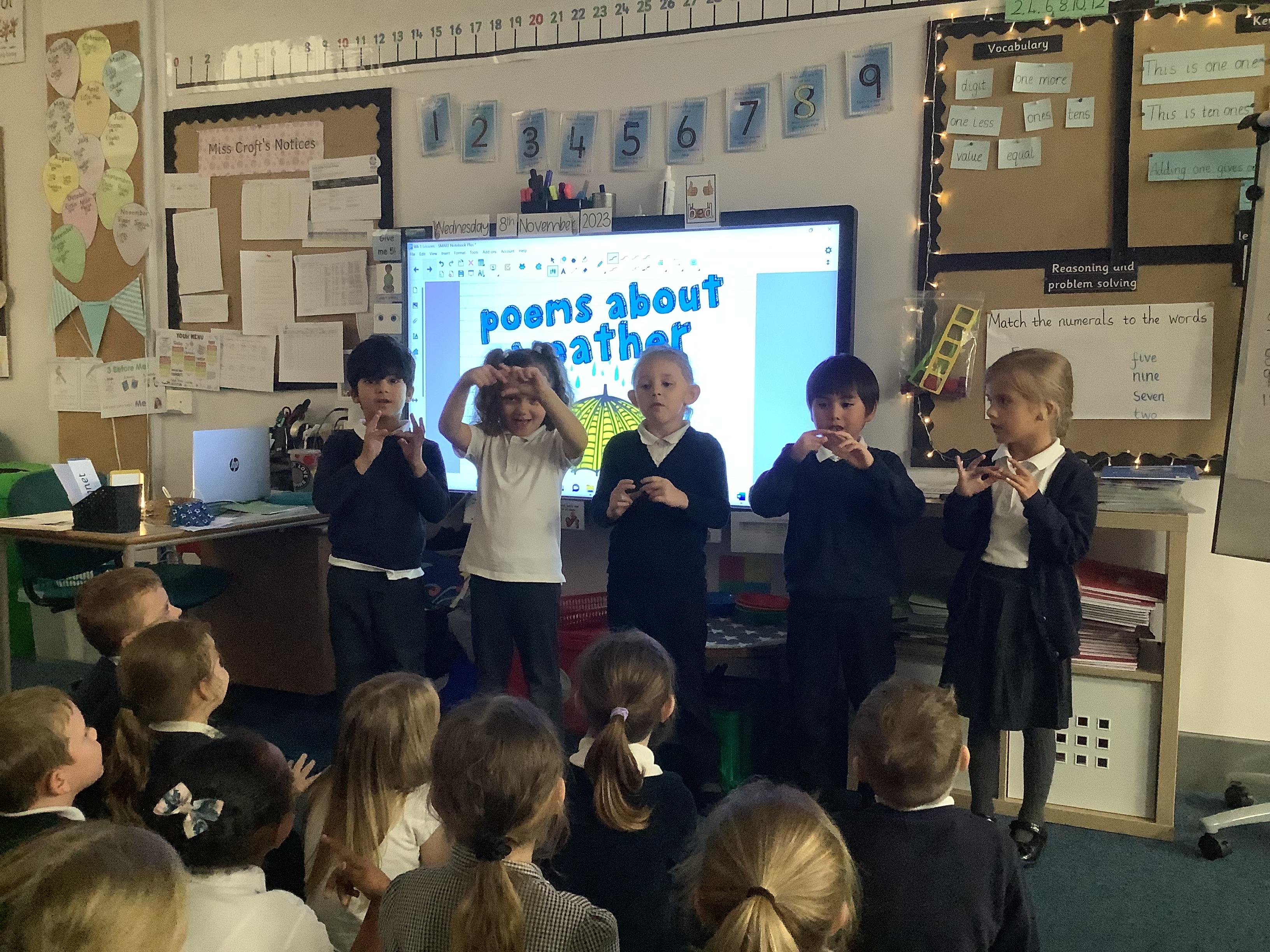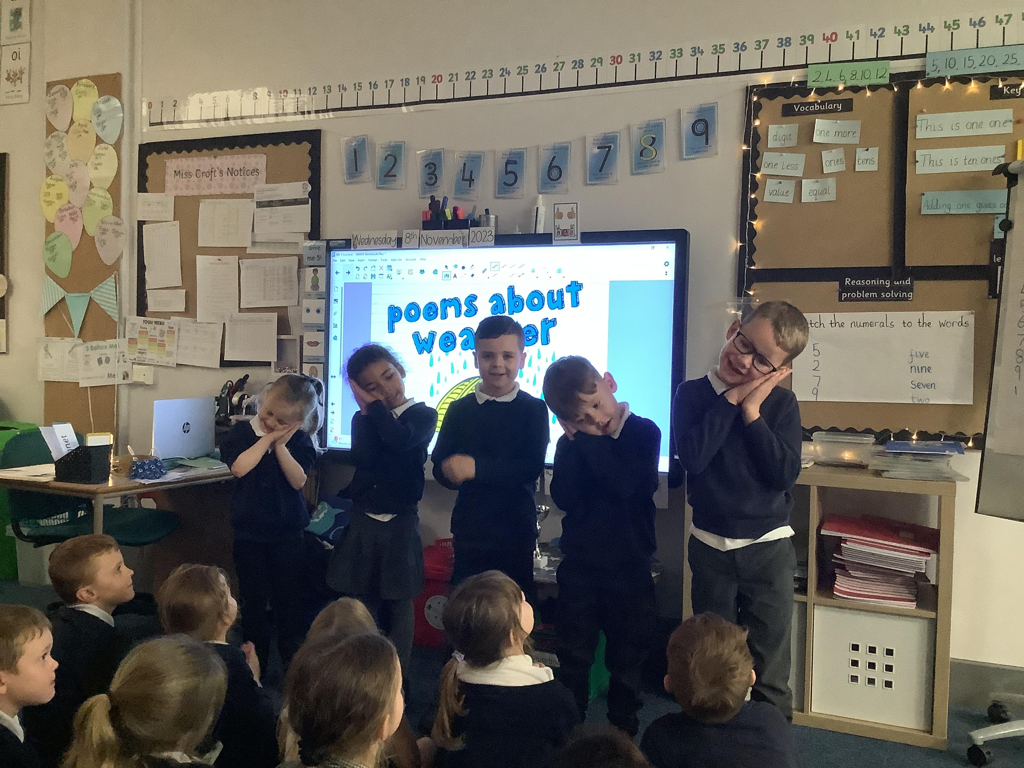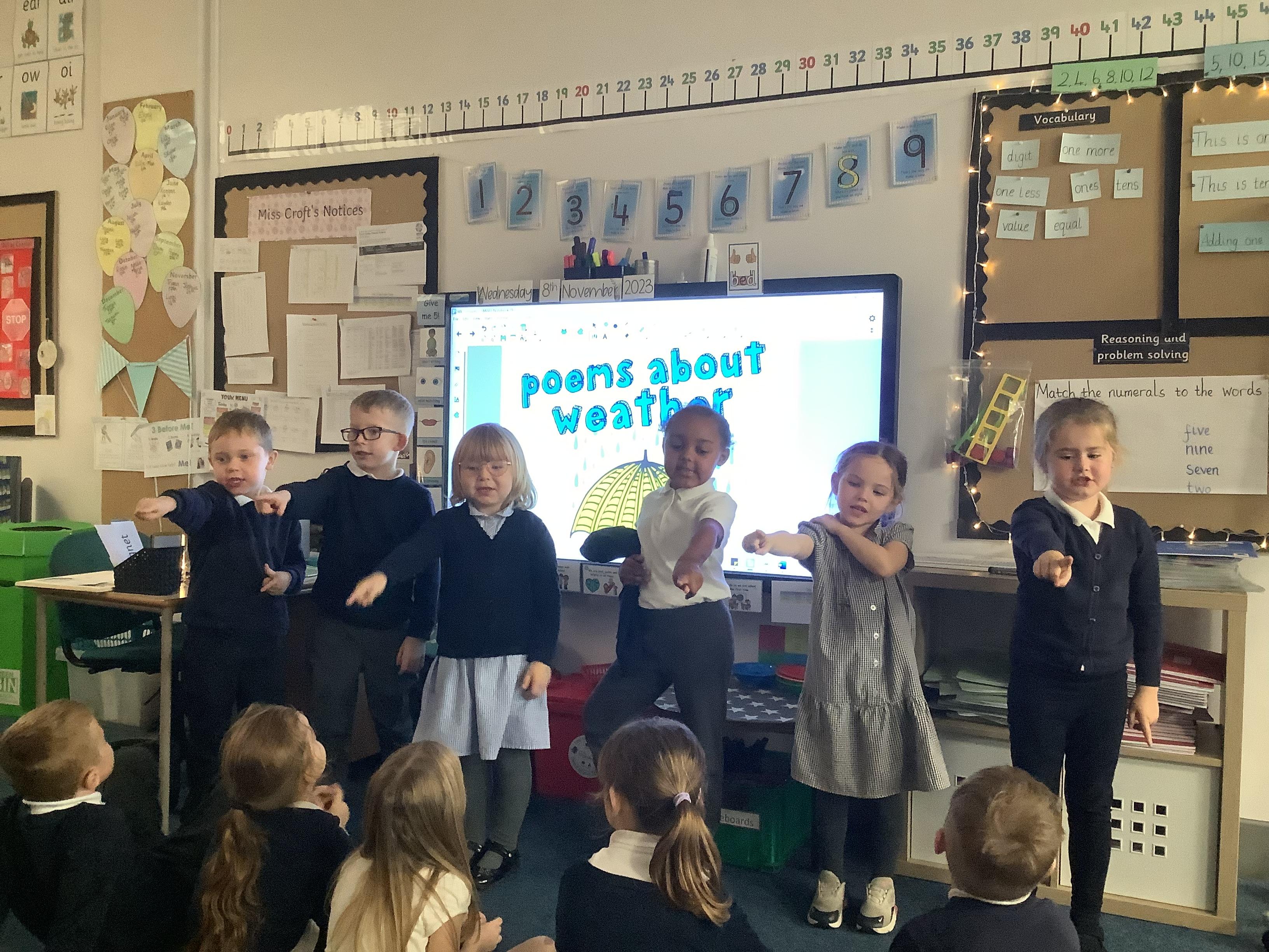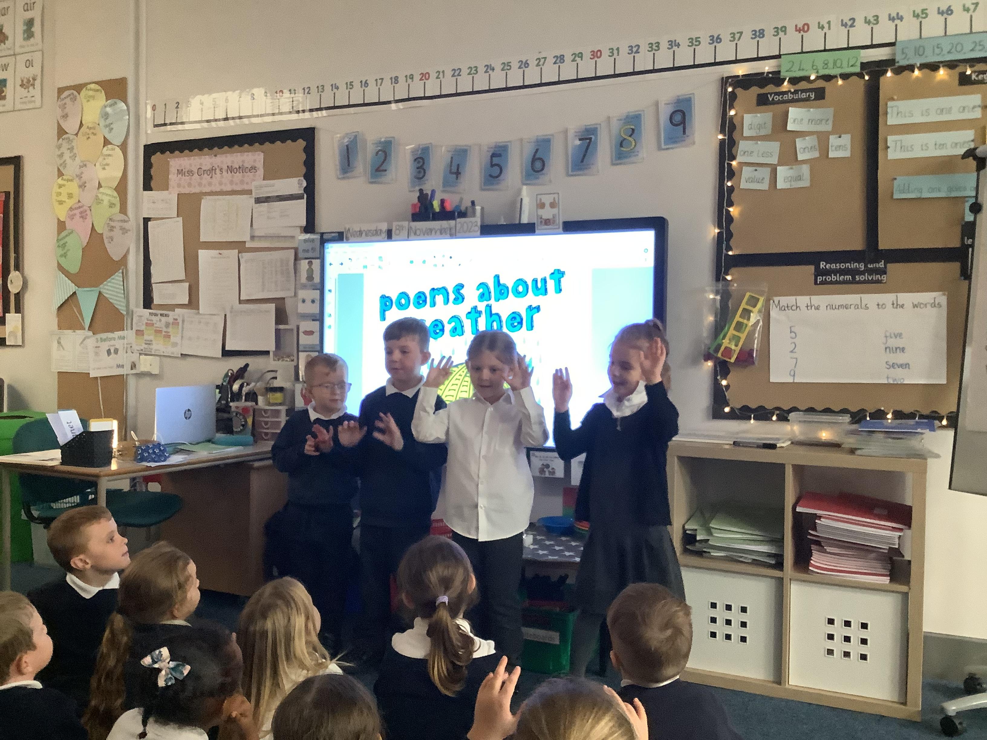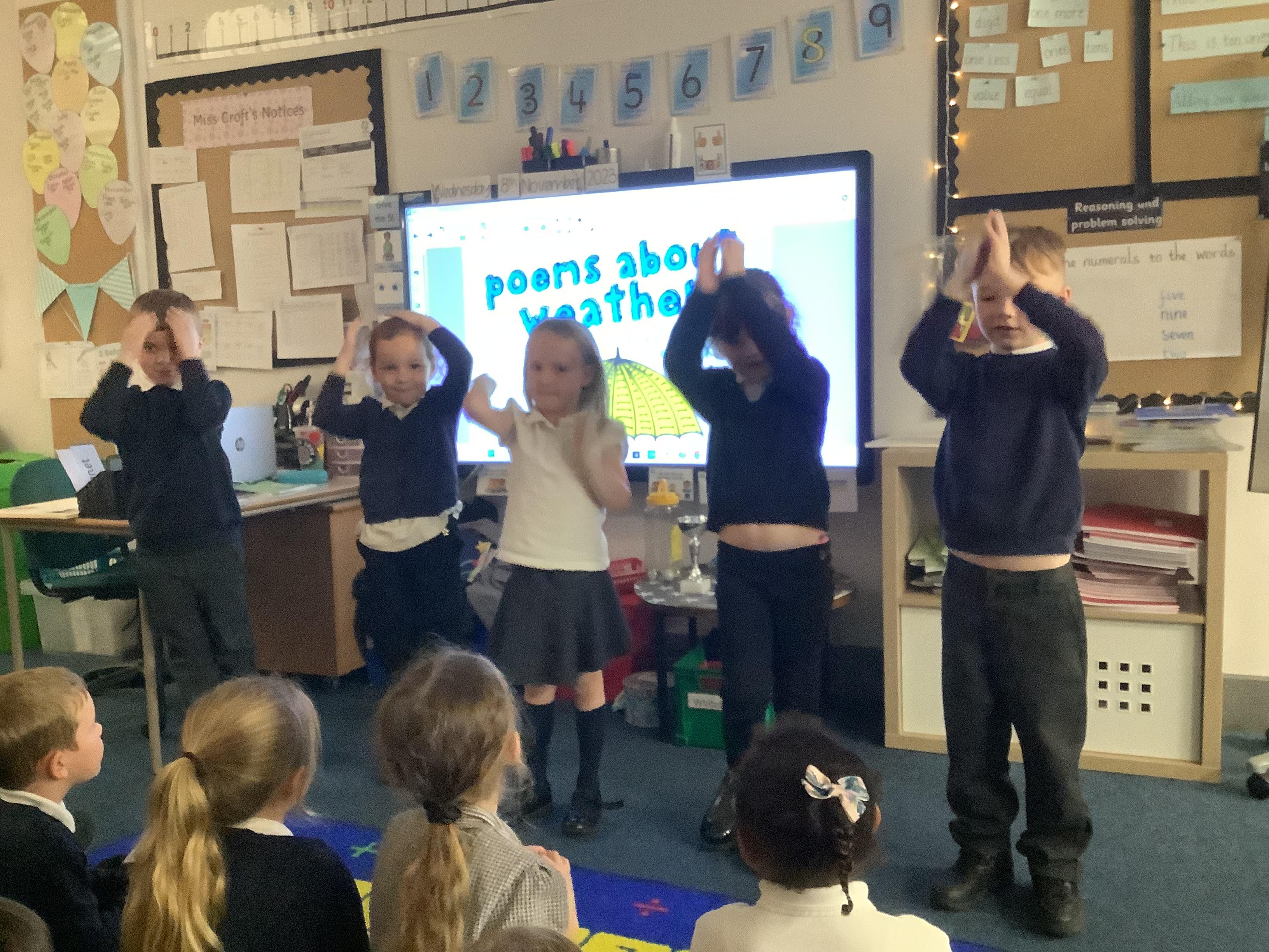 Year 1 learned lots of different poems about the weather. In groups they then worked hard and created actions for their poems and performed them to each other, the viewers then said what they liked and a wish for what would make it even better.