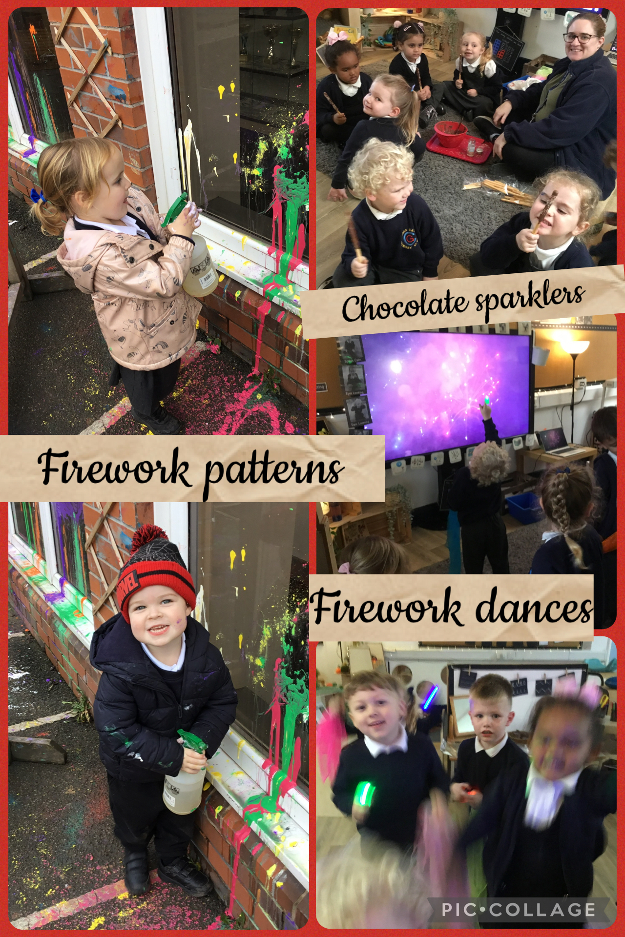 We celebrated Bonfire night with yummy firework chocolate snacks, colour explorations both inside and out and making our own firework dances.