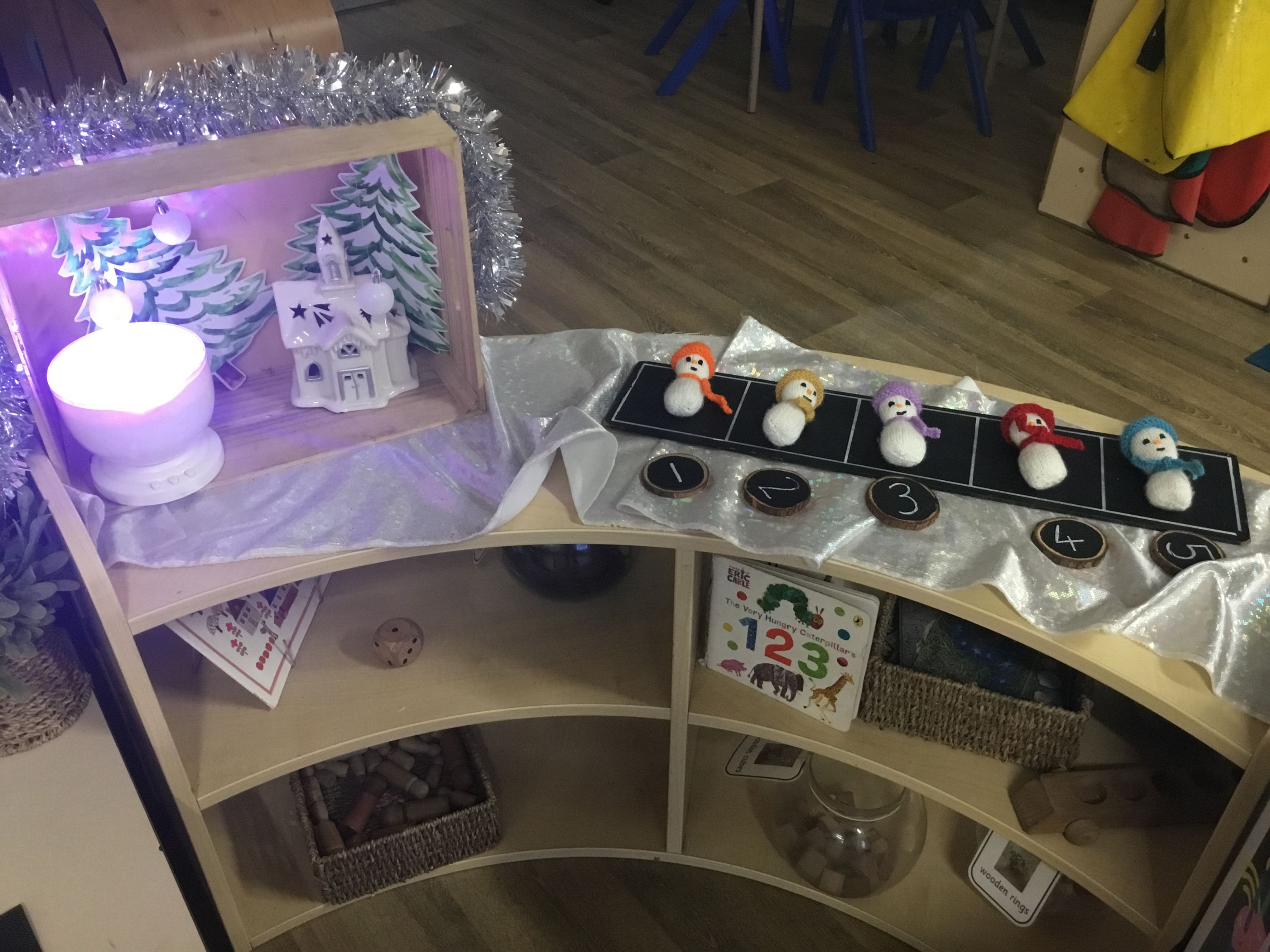 We use number rhymes to support the children's understanding of numbers. This week the children studied 'Five Little Snowmen.' We dressed as snowmen, explored numbers to five using the five frame and enjoyed singing the rhyme. In our Maths area, the children continue to explore the rhyme and develop their understanding of numbers to 5!