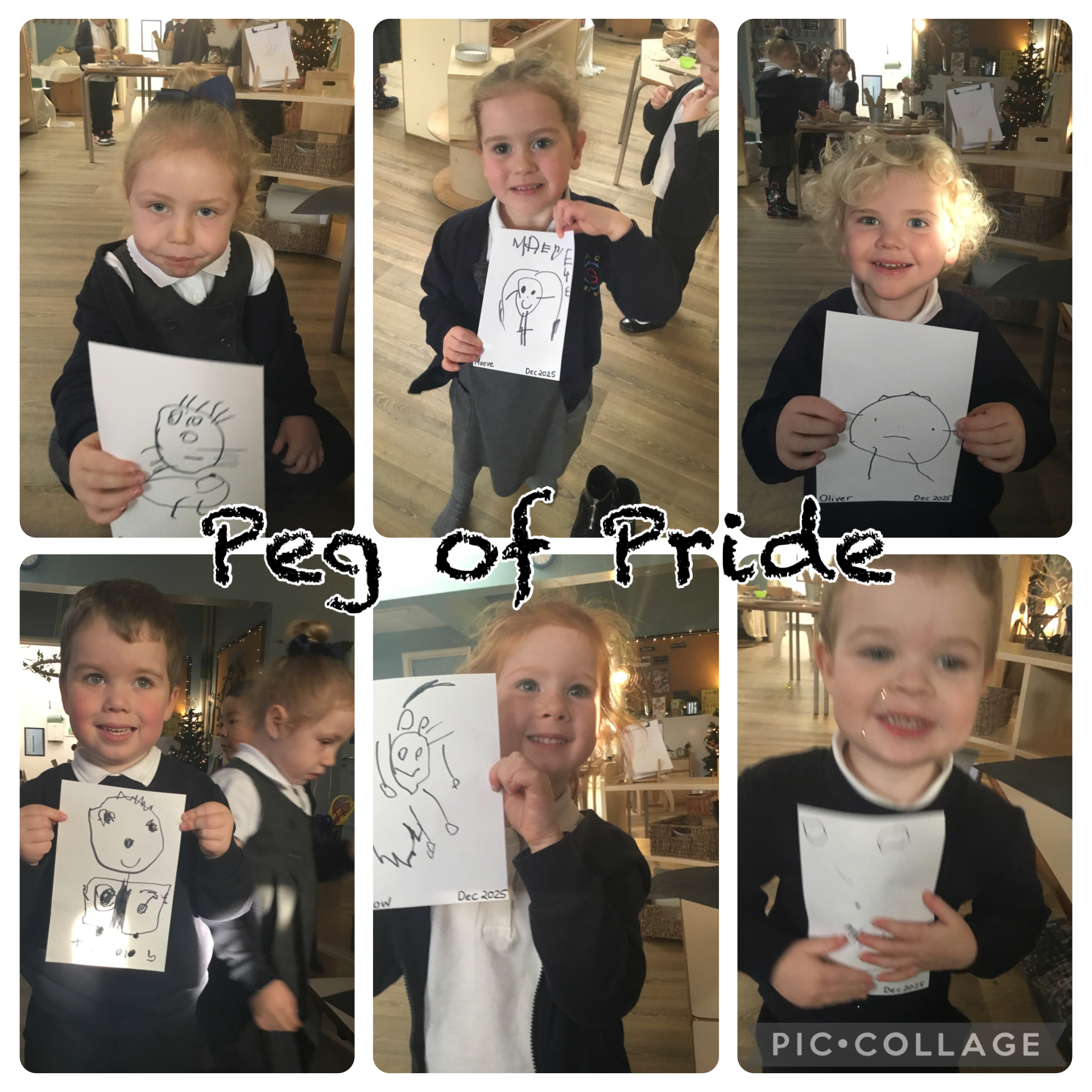 In nursery, we have a display of children's drawings. This is updated every half-term and records their development in drawing and mark making. The children have drawn some wonderful self portraits for our 'Peg of Pride' display.