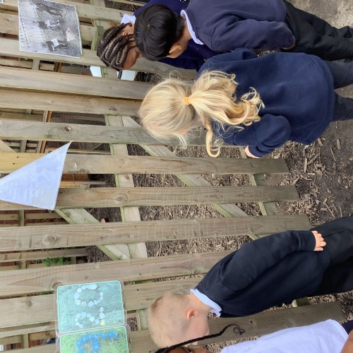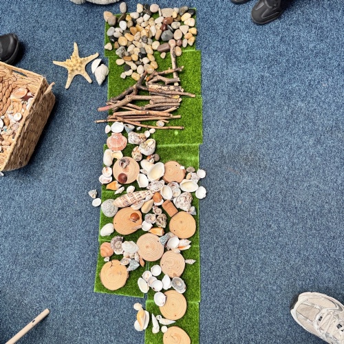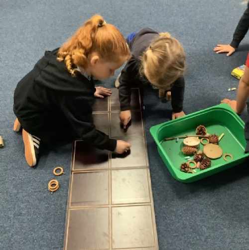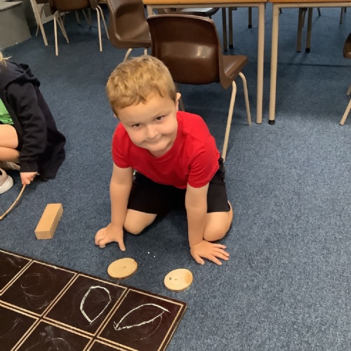 In Maths, we have been looking at using counters to represent objects. We were given natural materials and then had to use chalk to draw counters to represent numbers using a big tens frame.