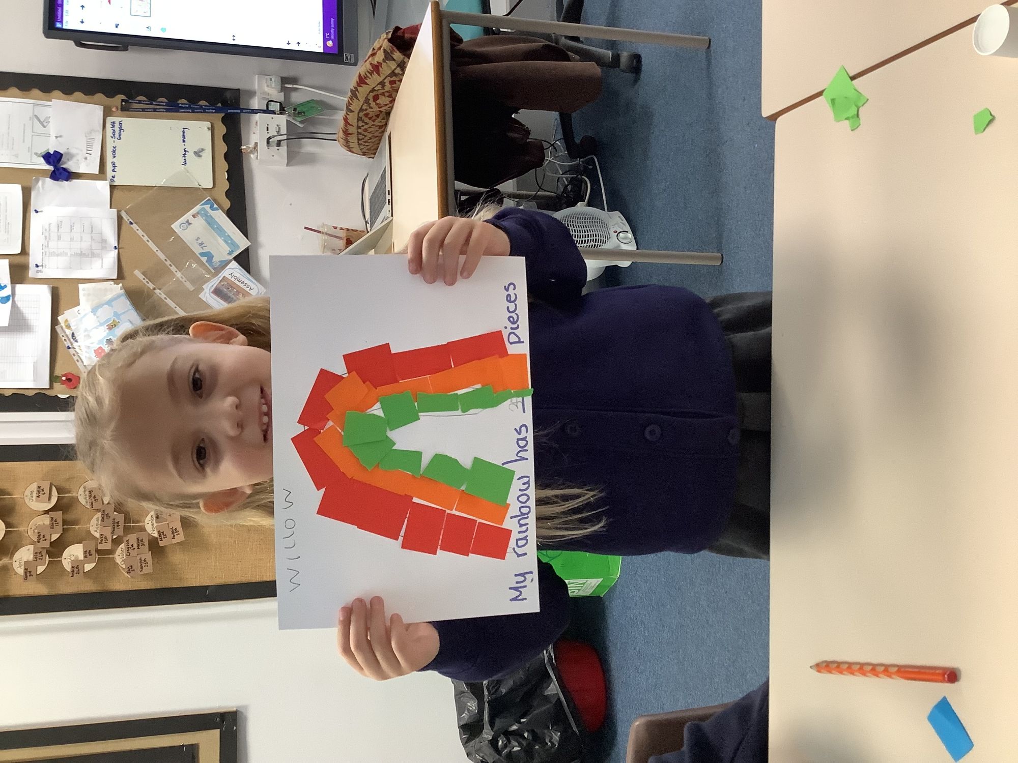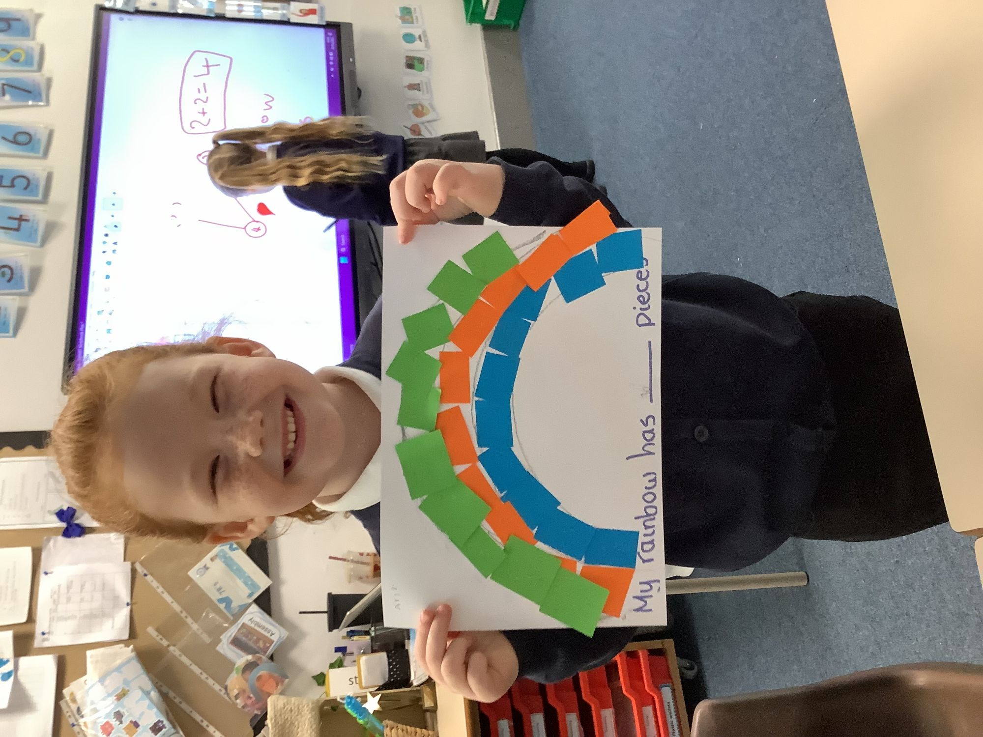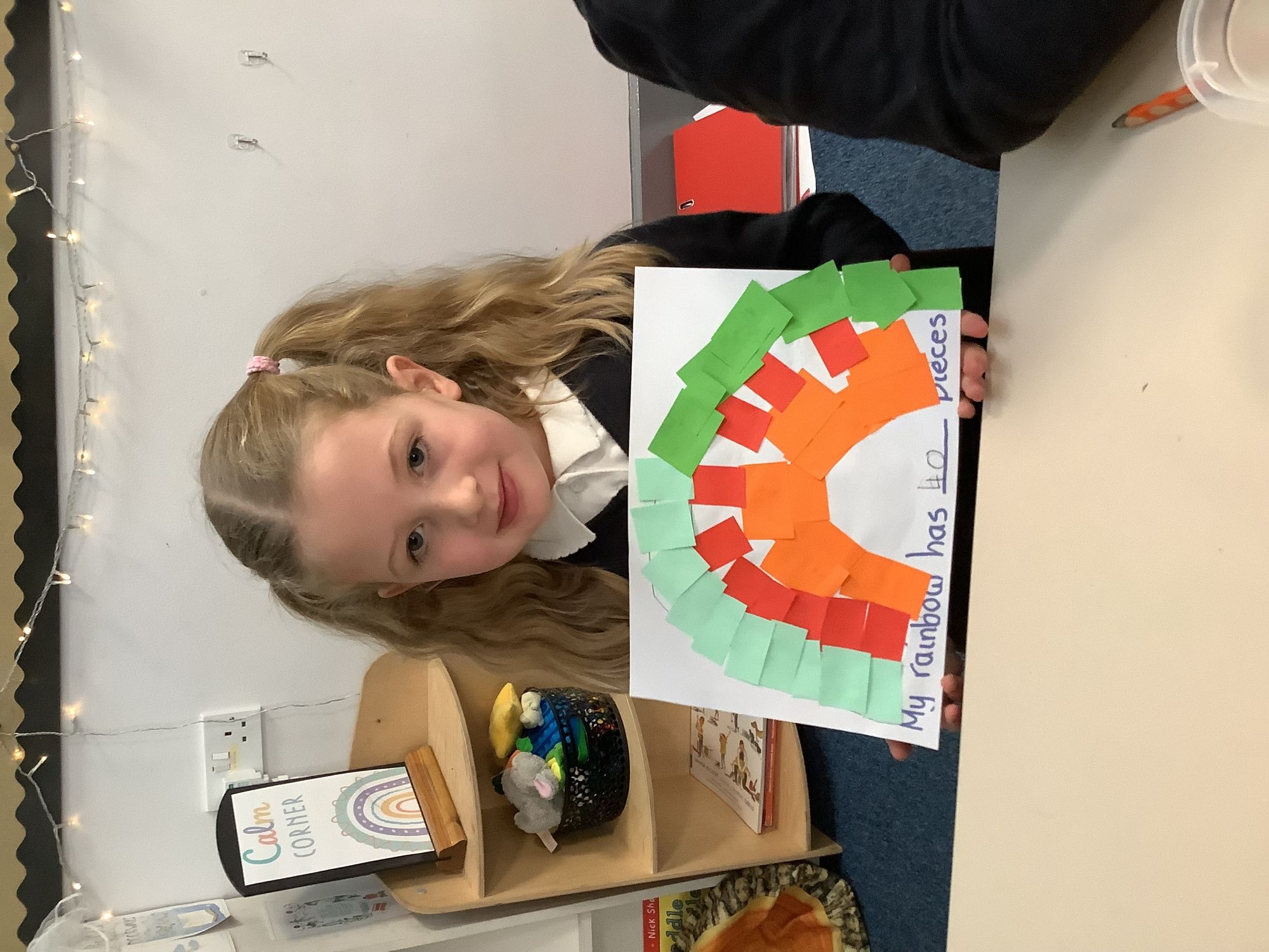 As part of multiplication day, we learnt to count in 10's. We created 10's rainbows! We had to use ten pieces of collage paper for one part of the rainbow, then once we had completed the rainbow, we counted up how many tens we had used and recorded our work.
