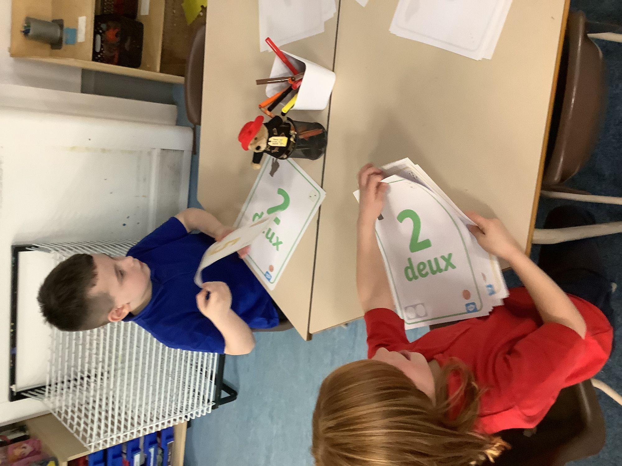 We spent the first of our French lessons learning our numbers to five. We played a game of snap where if we landed on the same number, we had to say it in French!