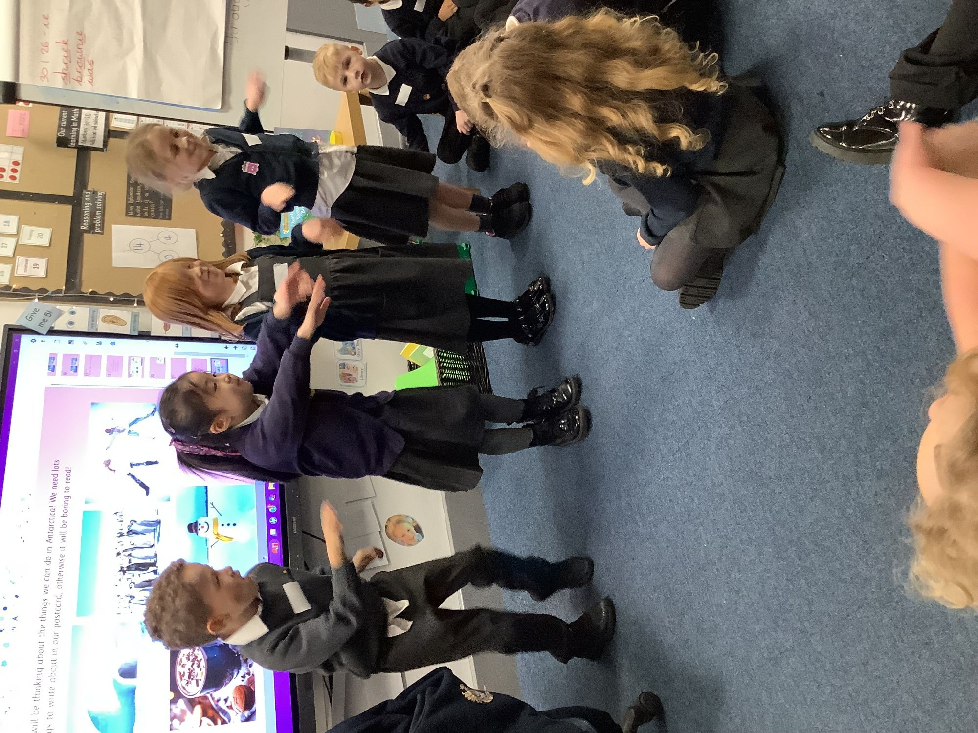 In our English lessons we are learning to write a postcard from Antarctica. Today, we acted out the different activities we did there, ready to write in our final postcard next week! We made hot chocolate, snow angels, snowmen, had a dancing party with the penguins and built an igloo. It was a very busy lesson!
