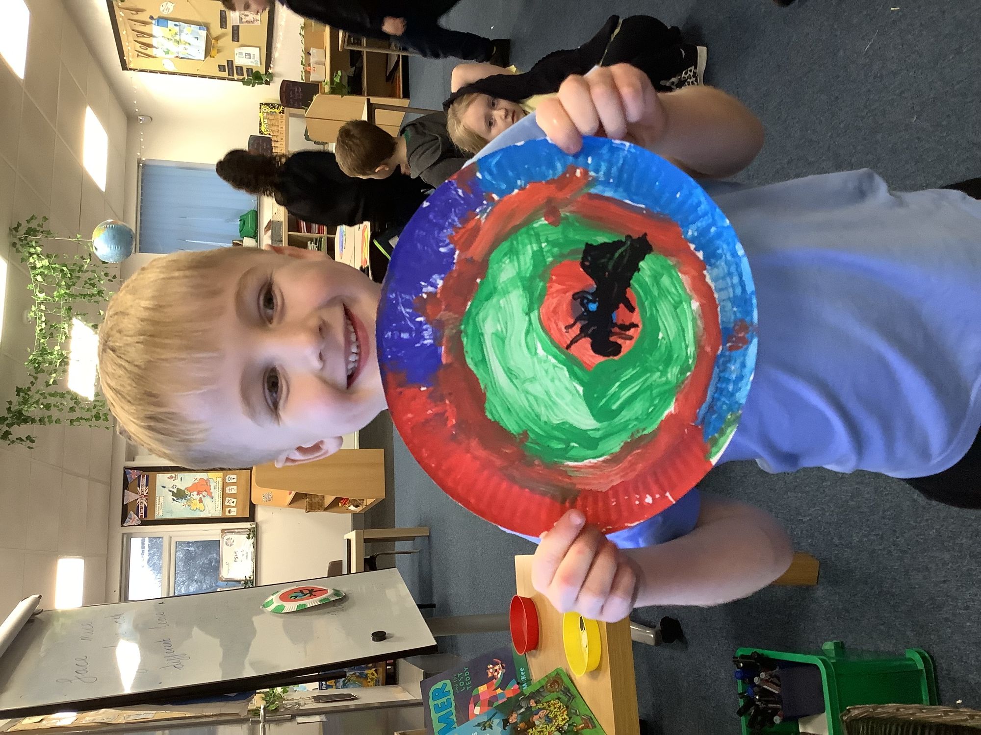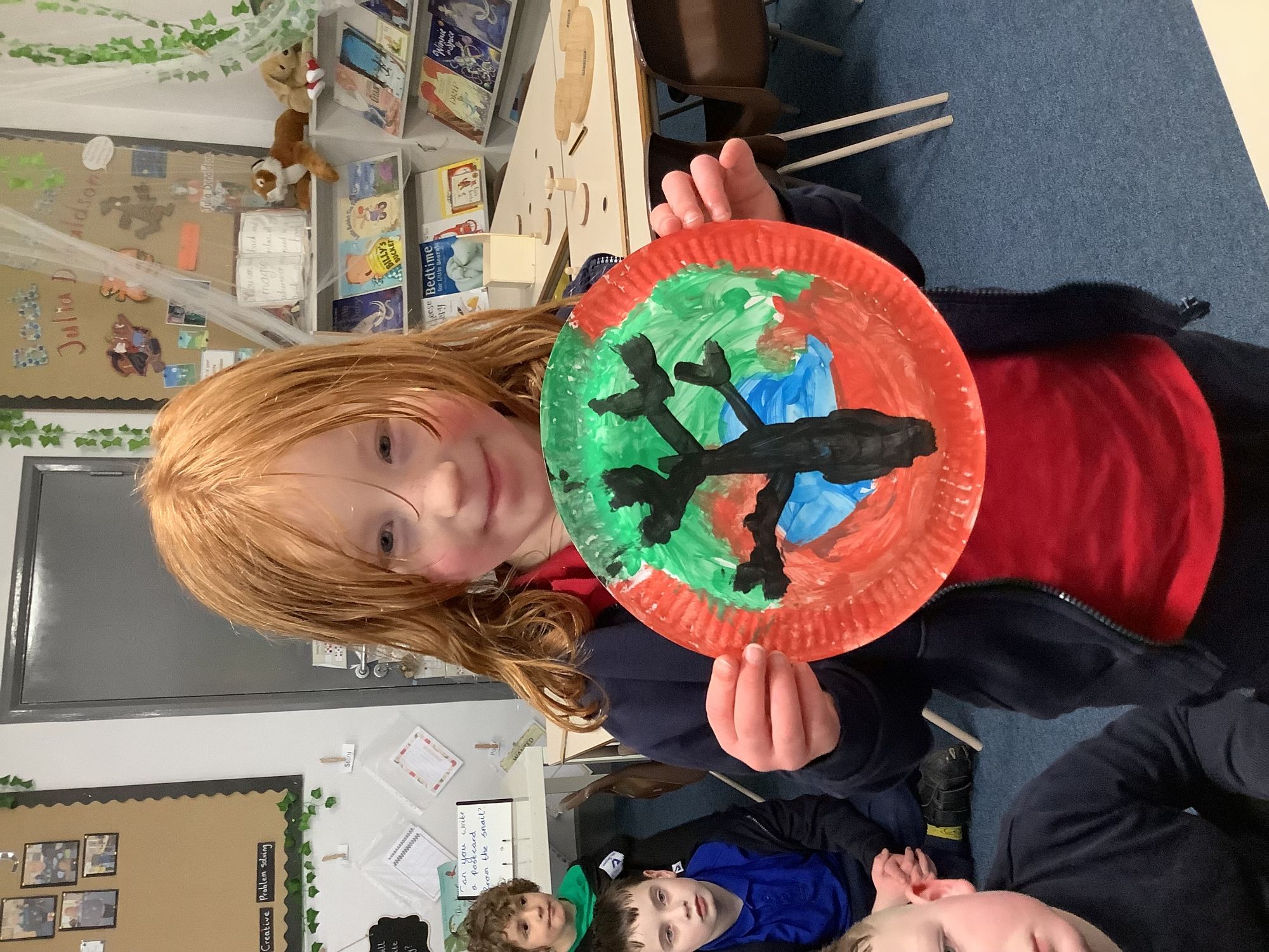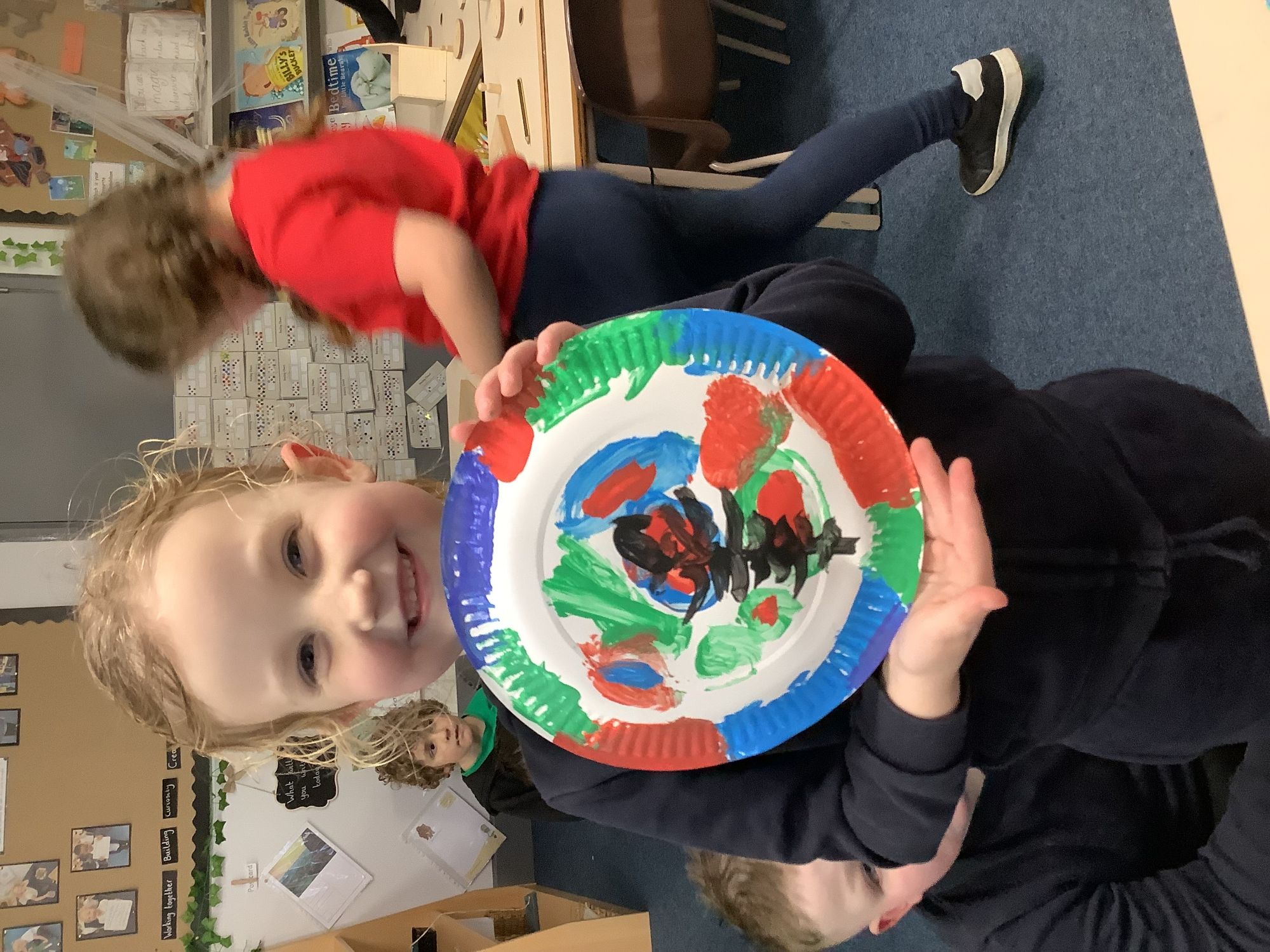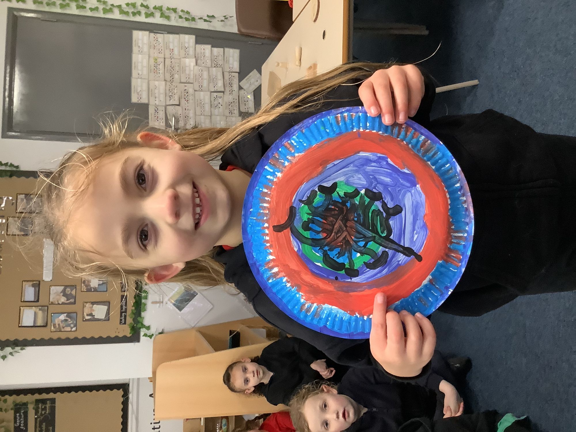 We completed our final art pieces this week. We painted a plate in the style of Clarice Cliff. We painted the background in bright colours and then drew a tree on the front.