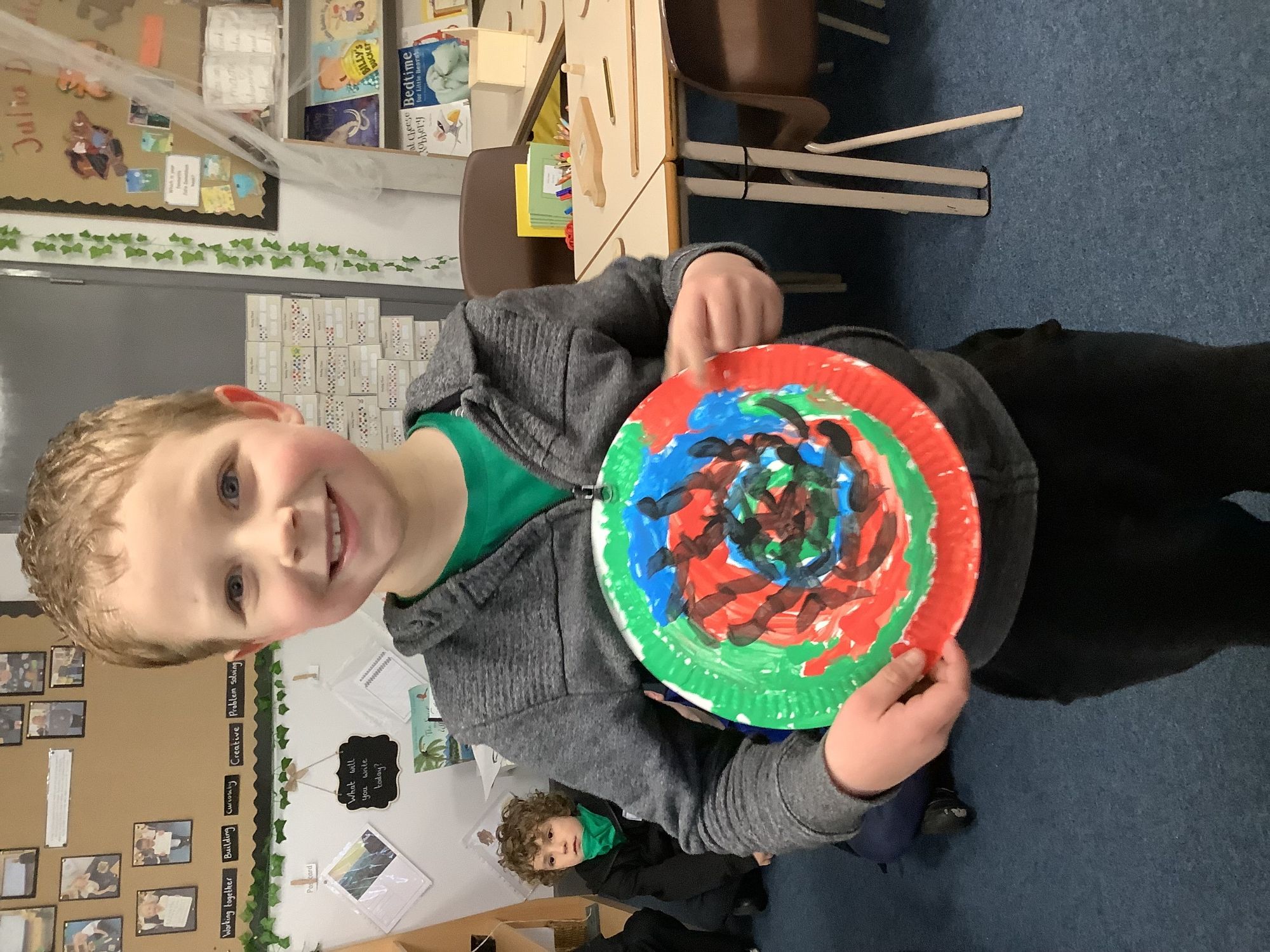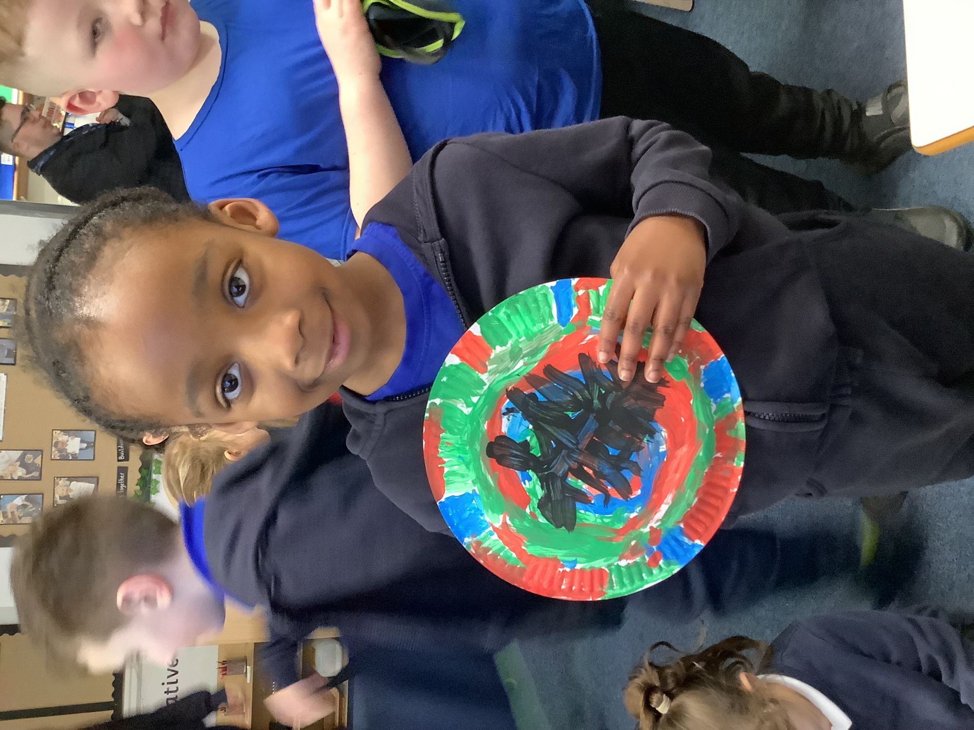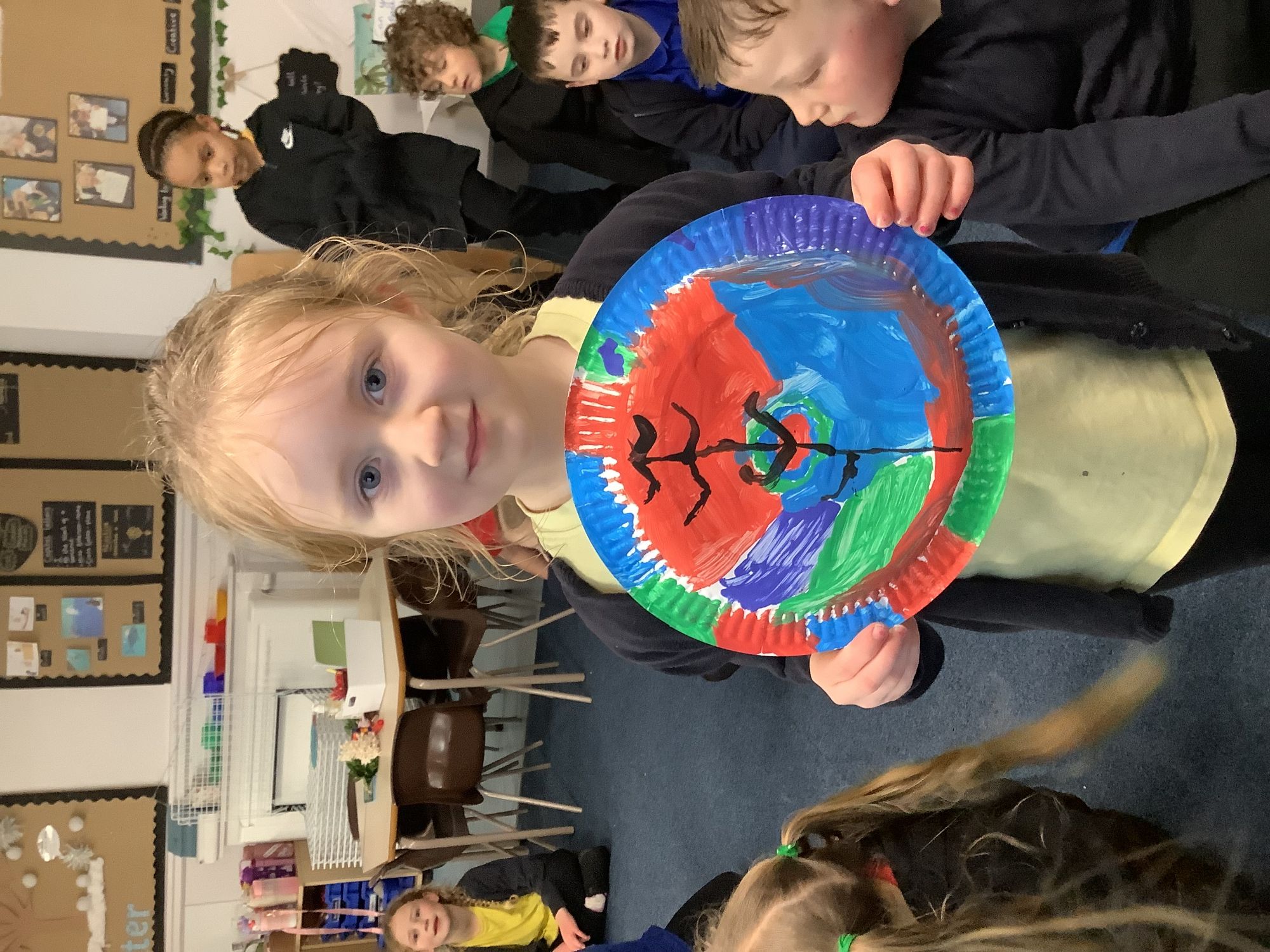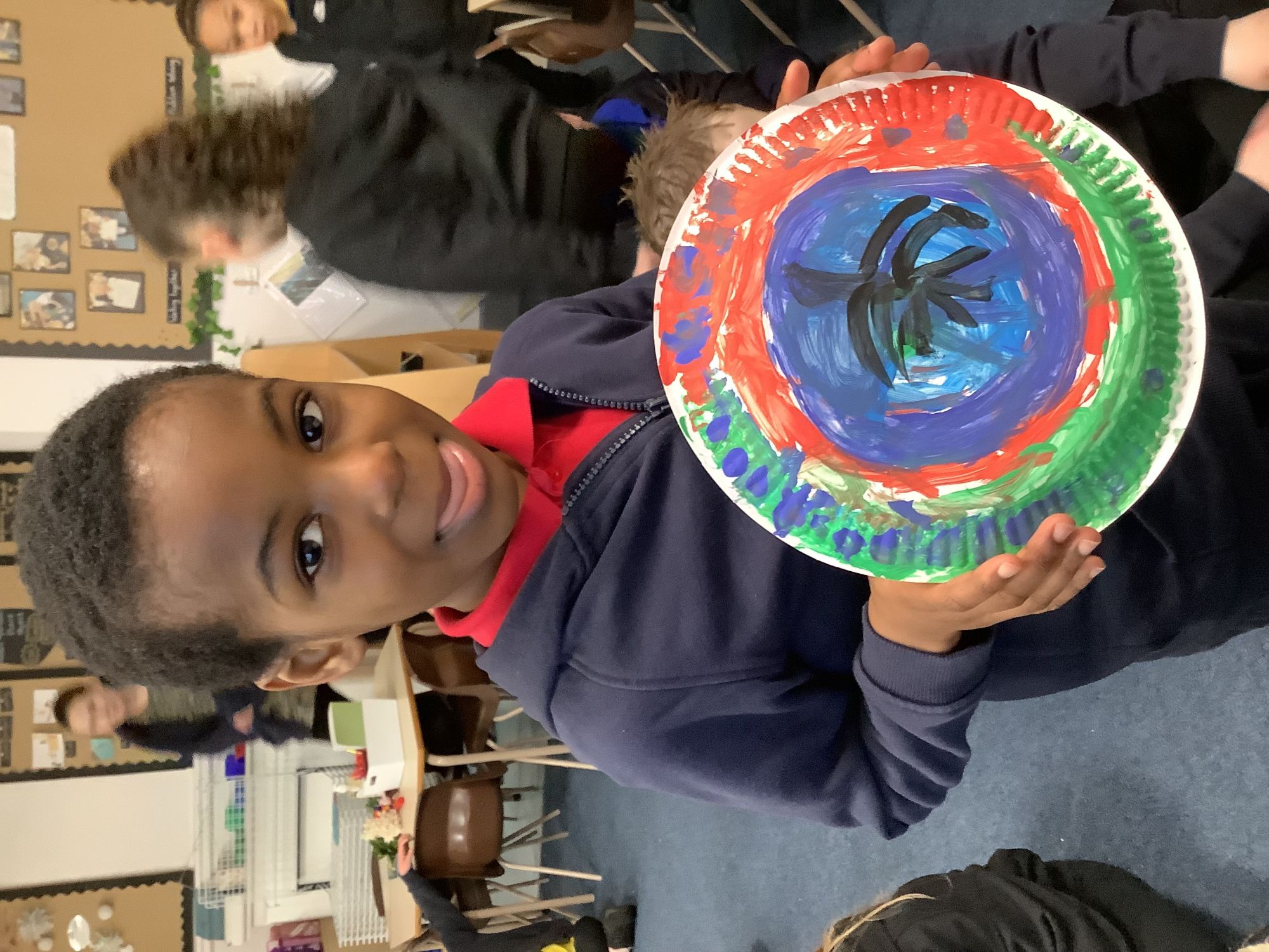 We completed our final art pieces this week. We painted a plate in the style of Clarice Cliff. We painted the background in bright colours and then drew a tree on the front.