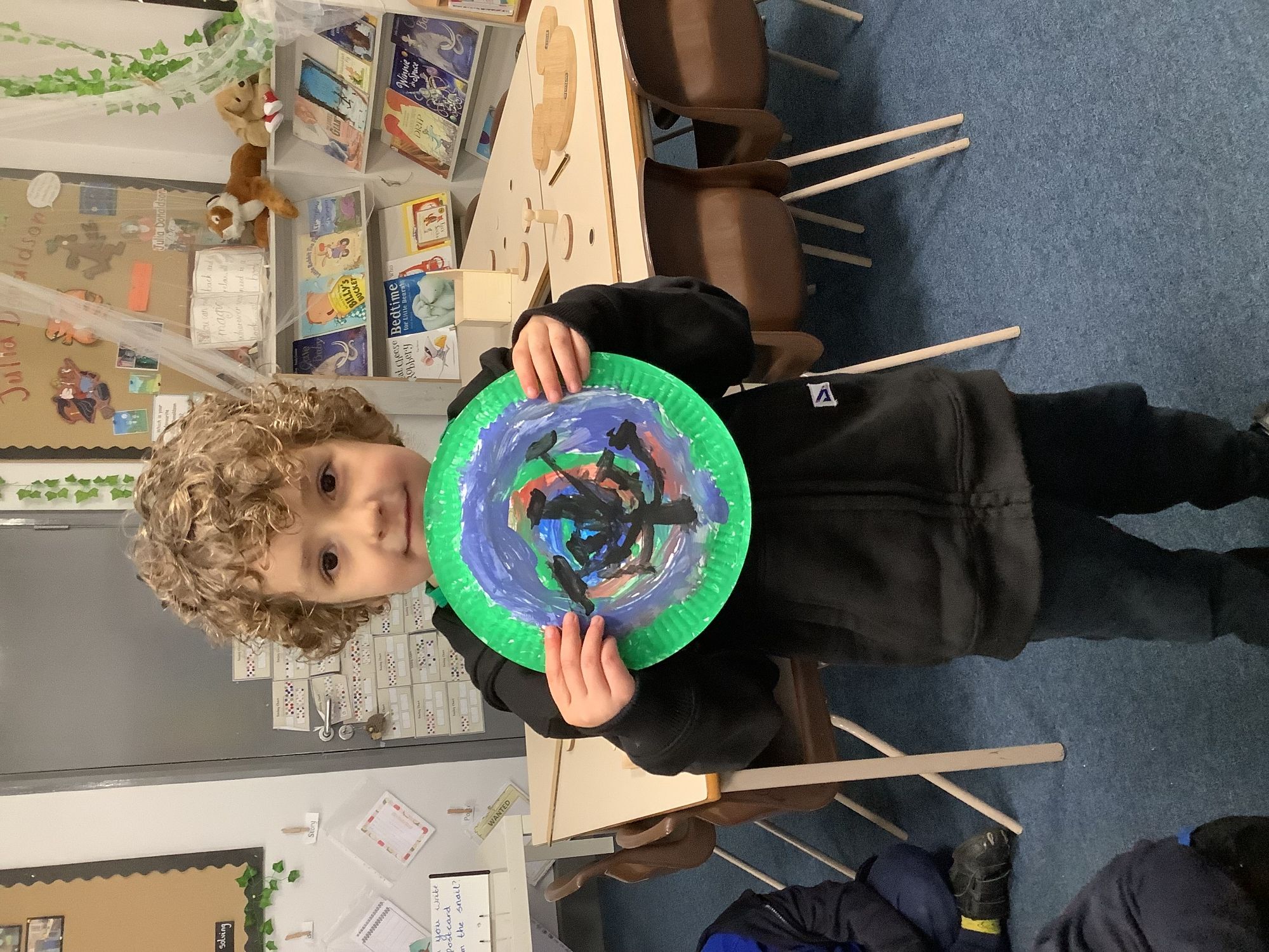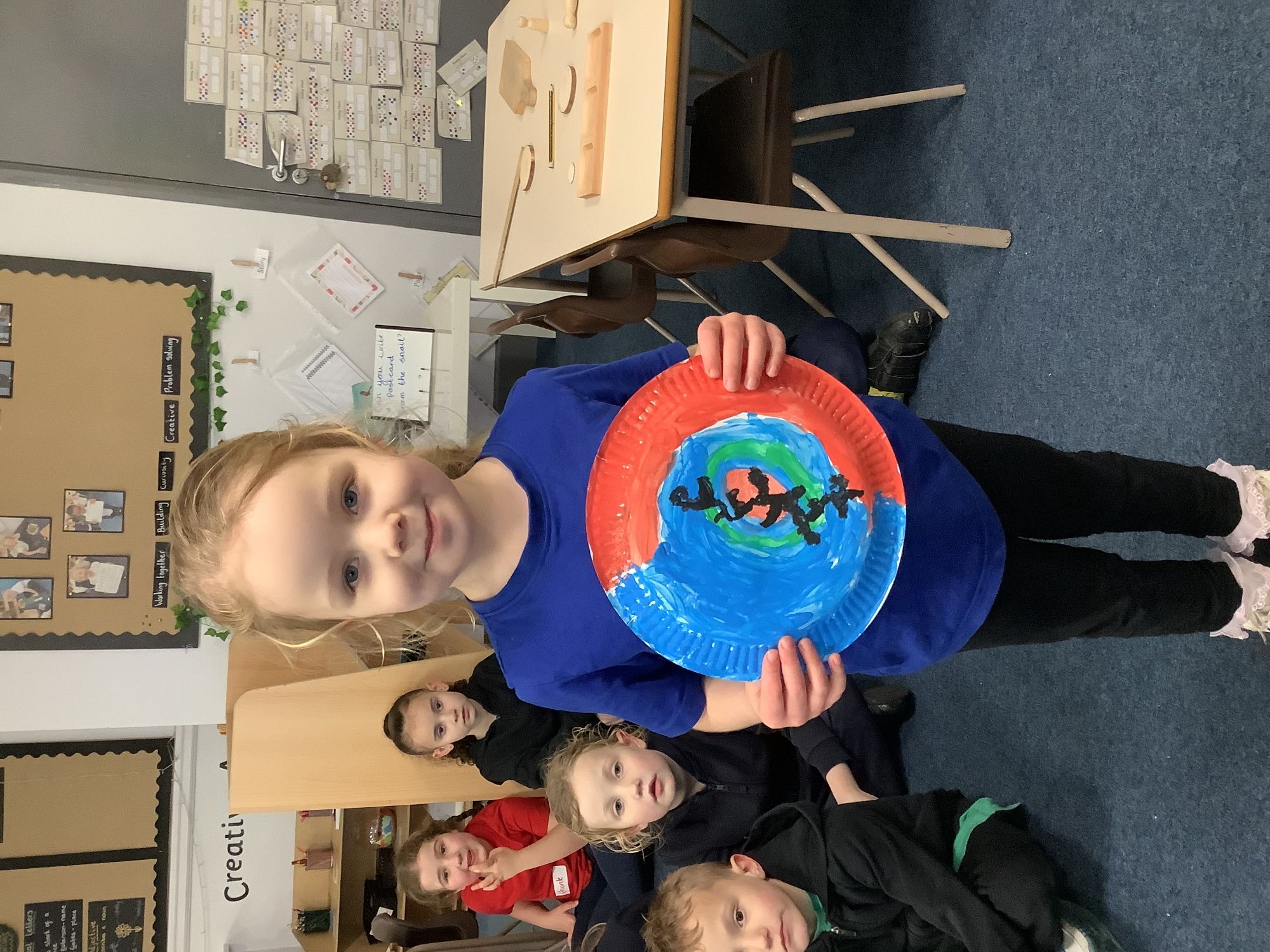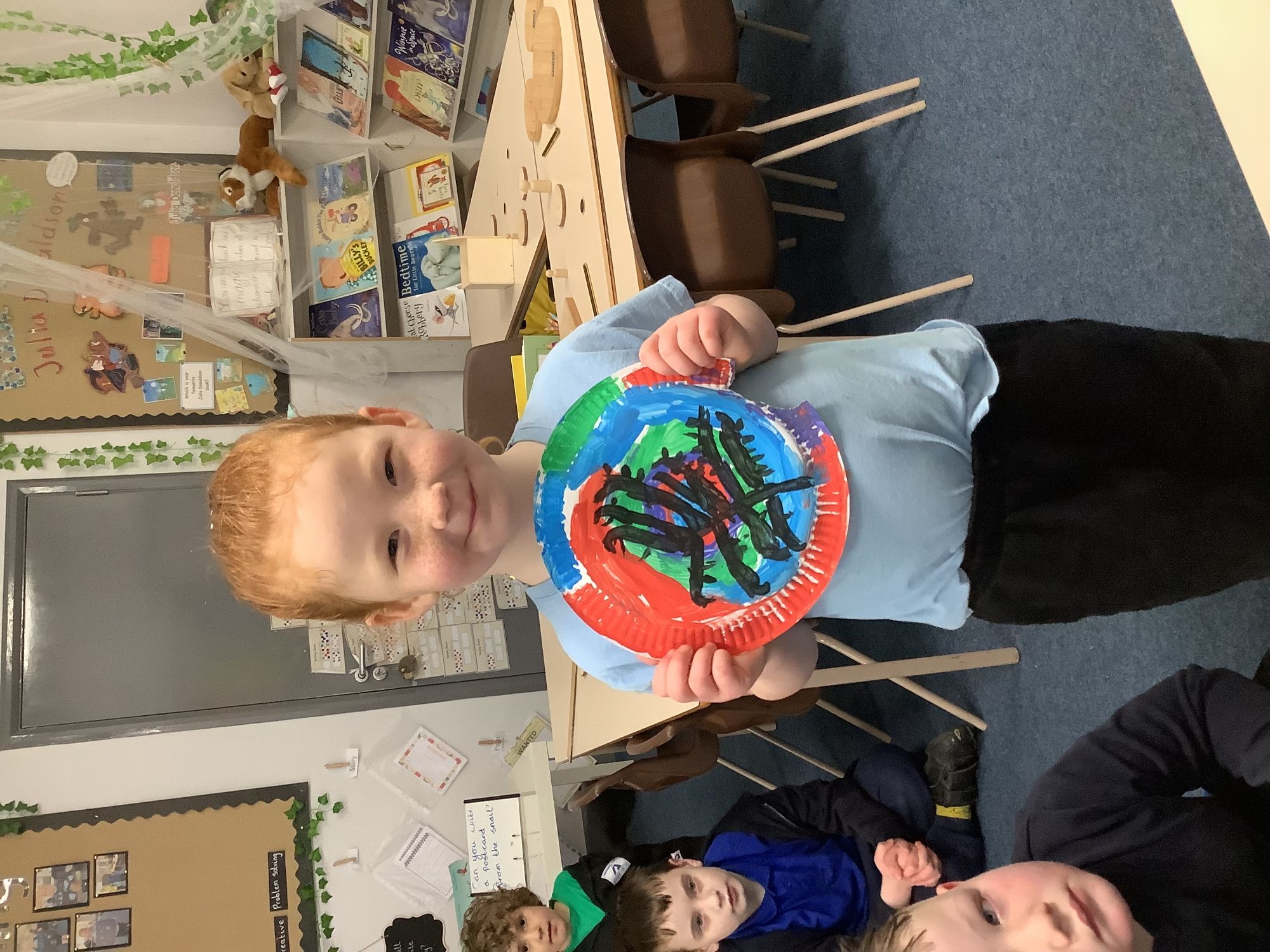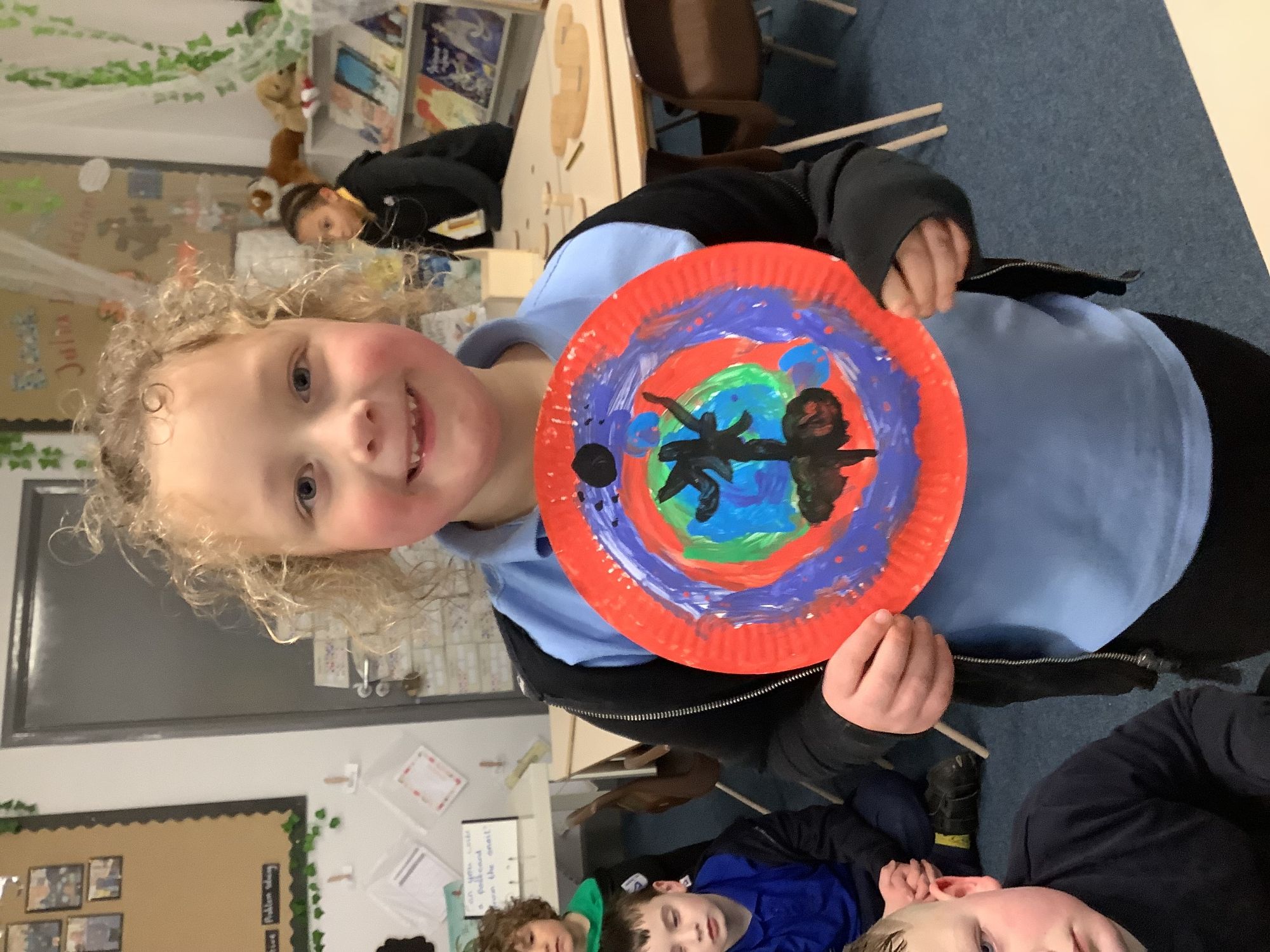 We completed our final art pieces this week. We painted a plate in the style of Clarice Cliff. We painted the background in bright colours and then drew a tree on the front.