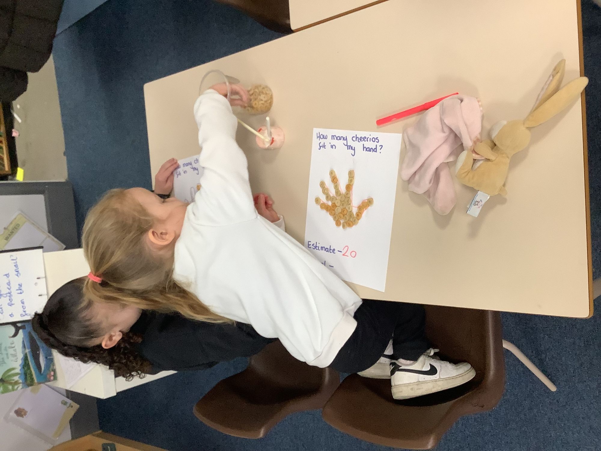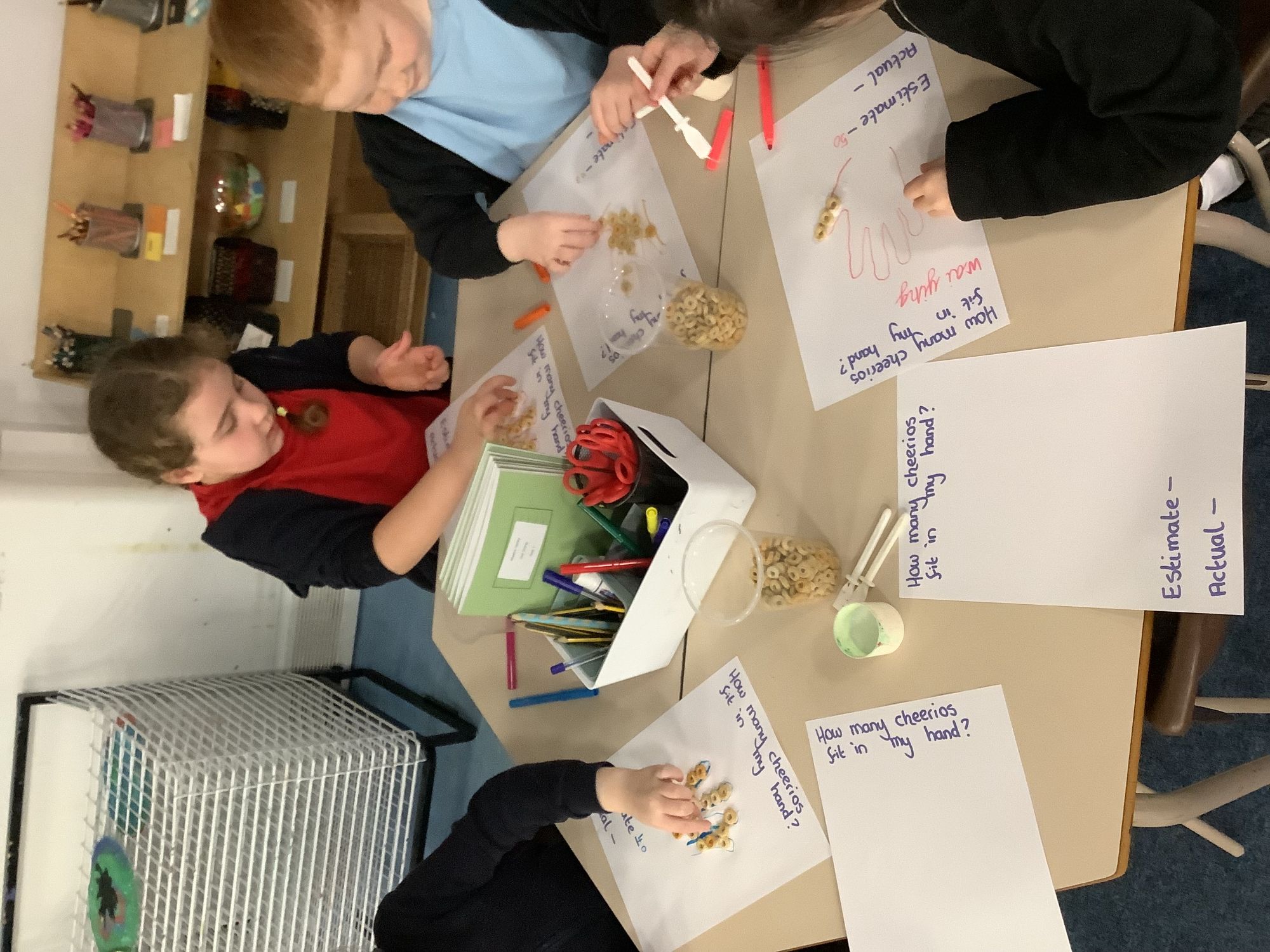 We had lots of fun on number day! We estimated how many cheerios would fit on our hands, then we stuck them on and saw whp had the closest guess.