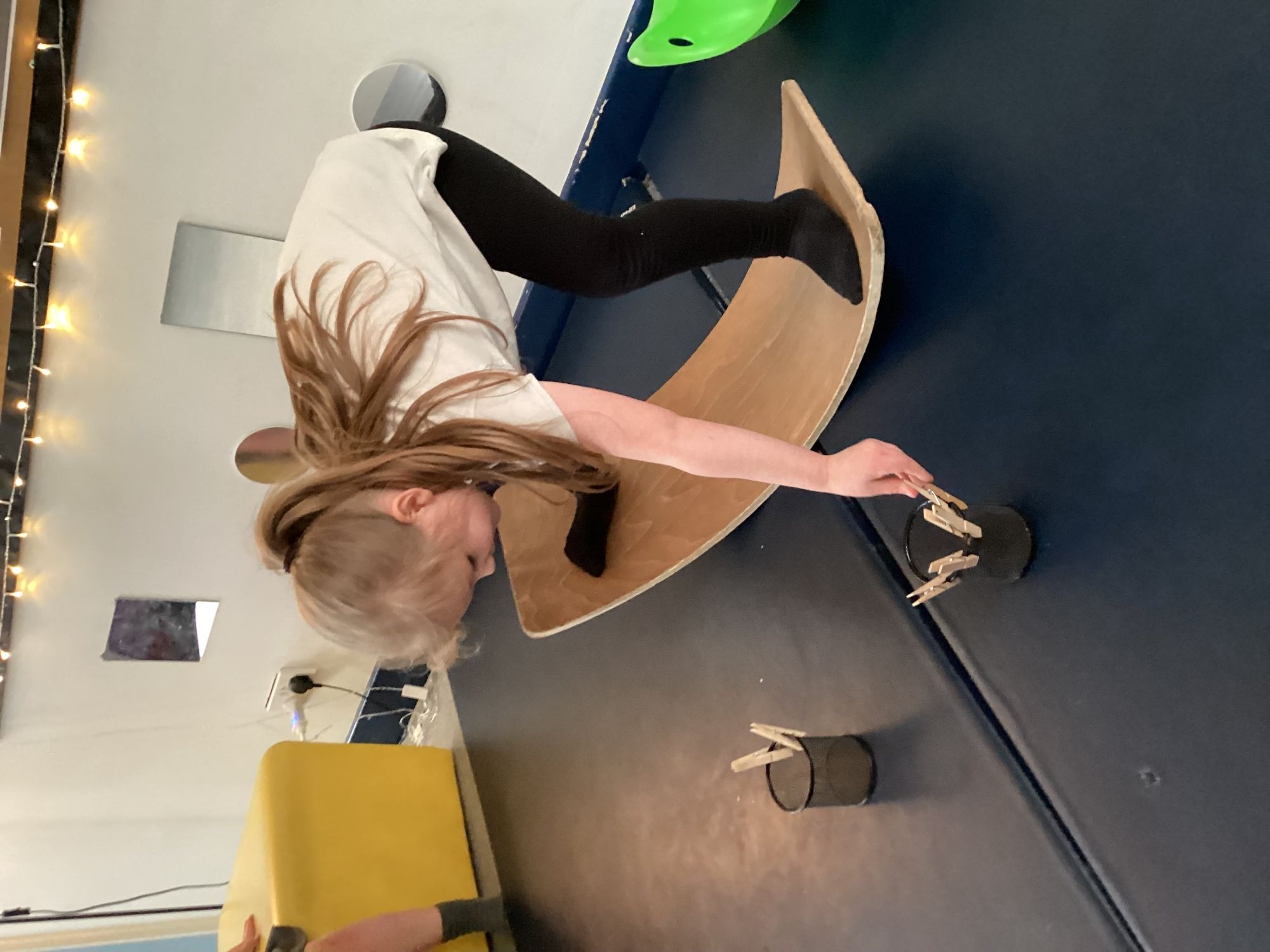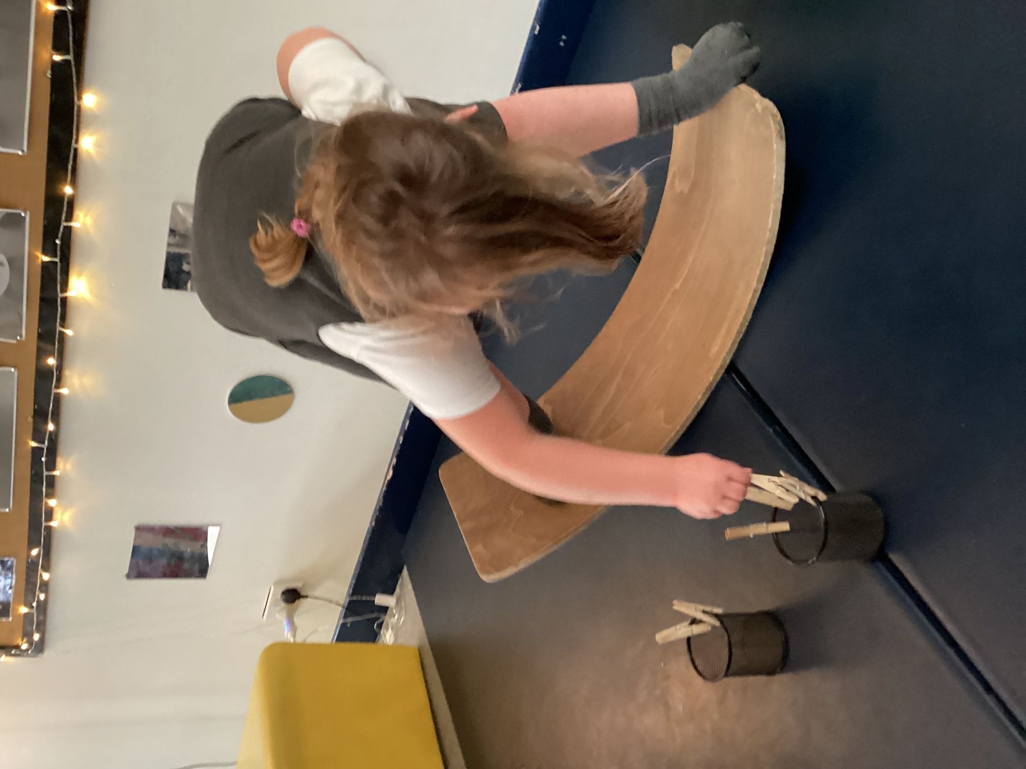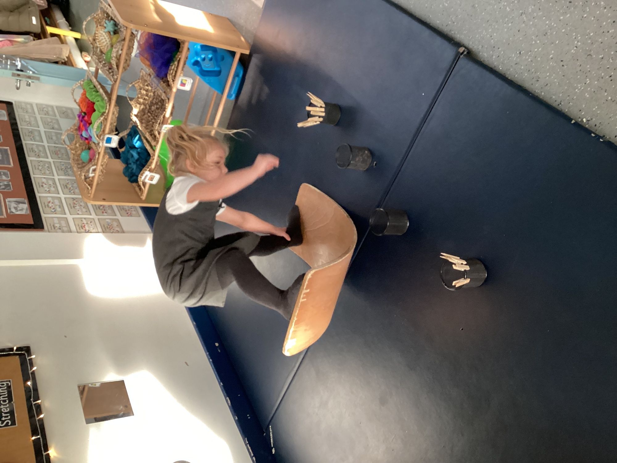 The children love to play in our indoor movement area. They were inspired to try the challenge that involved moving the pegs from one pot to another whilst balancing on the balance board! This required lots of concentration and core strength, but the children demonstrated lots of resilience.