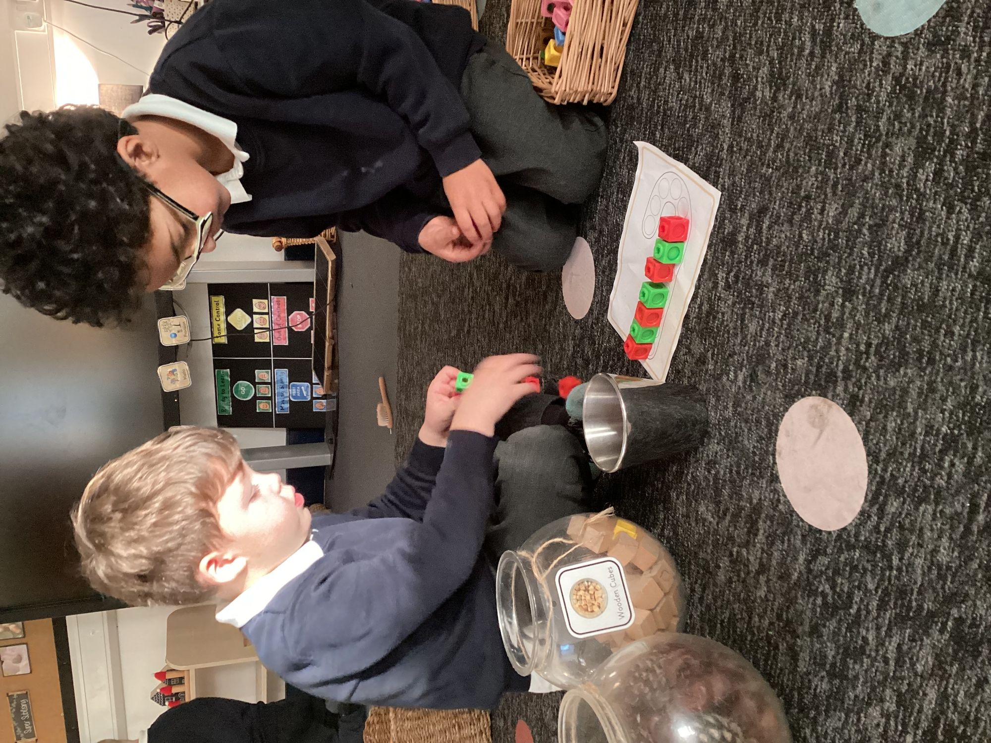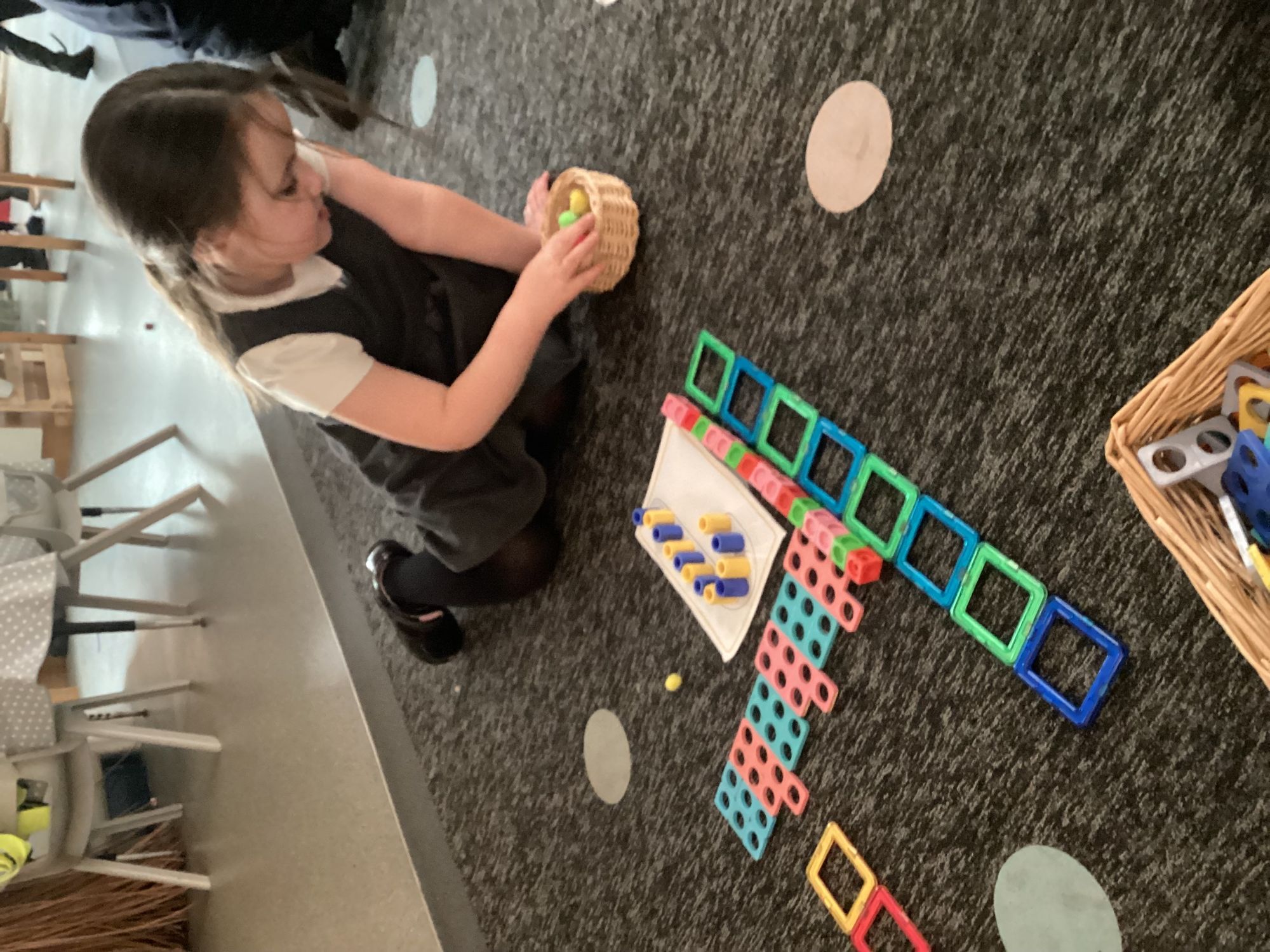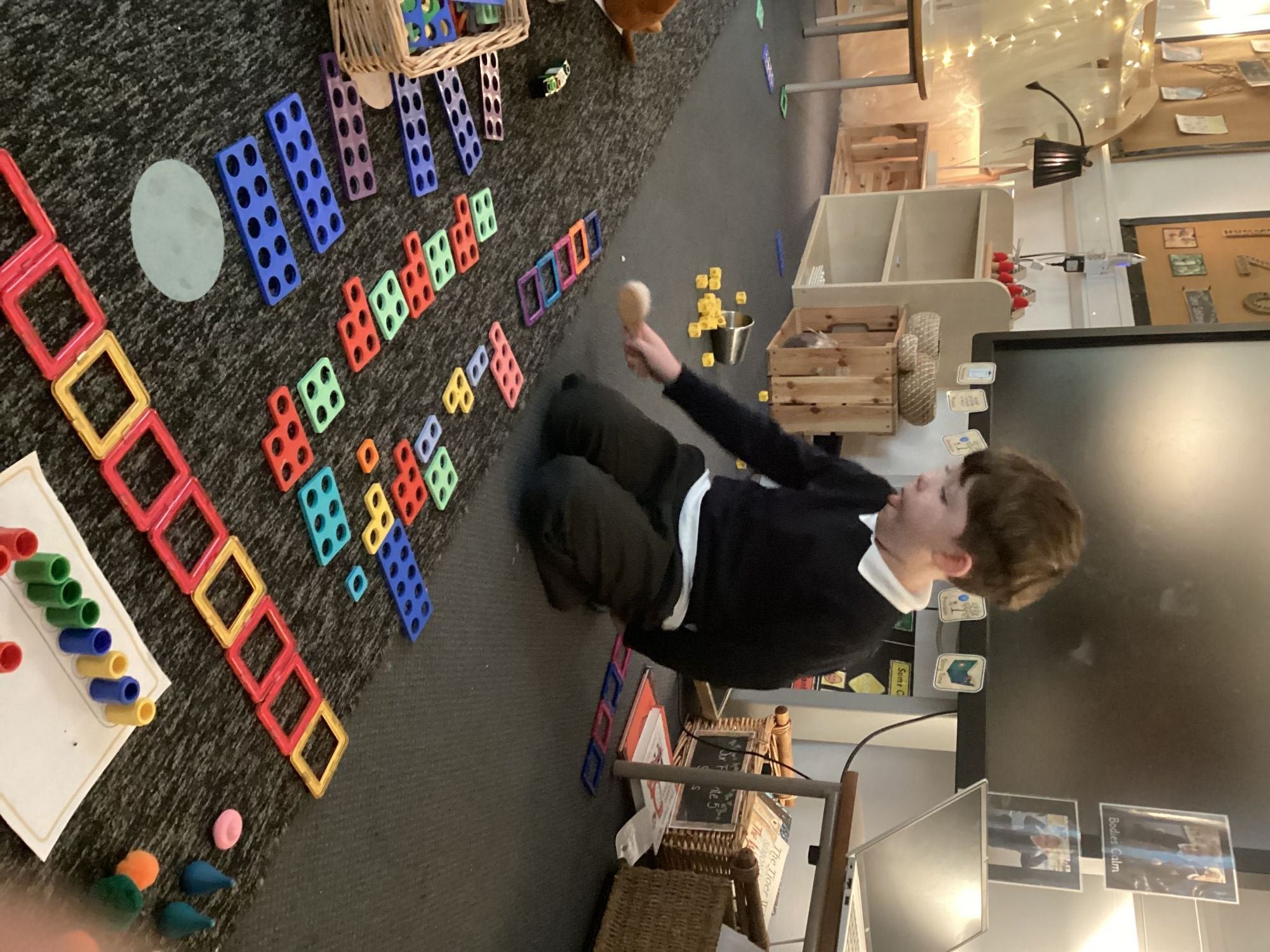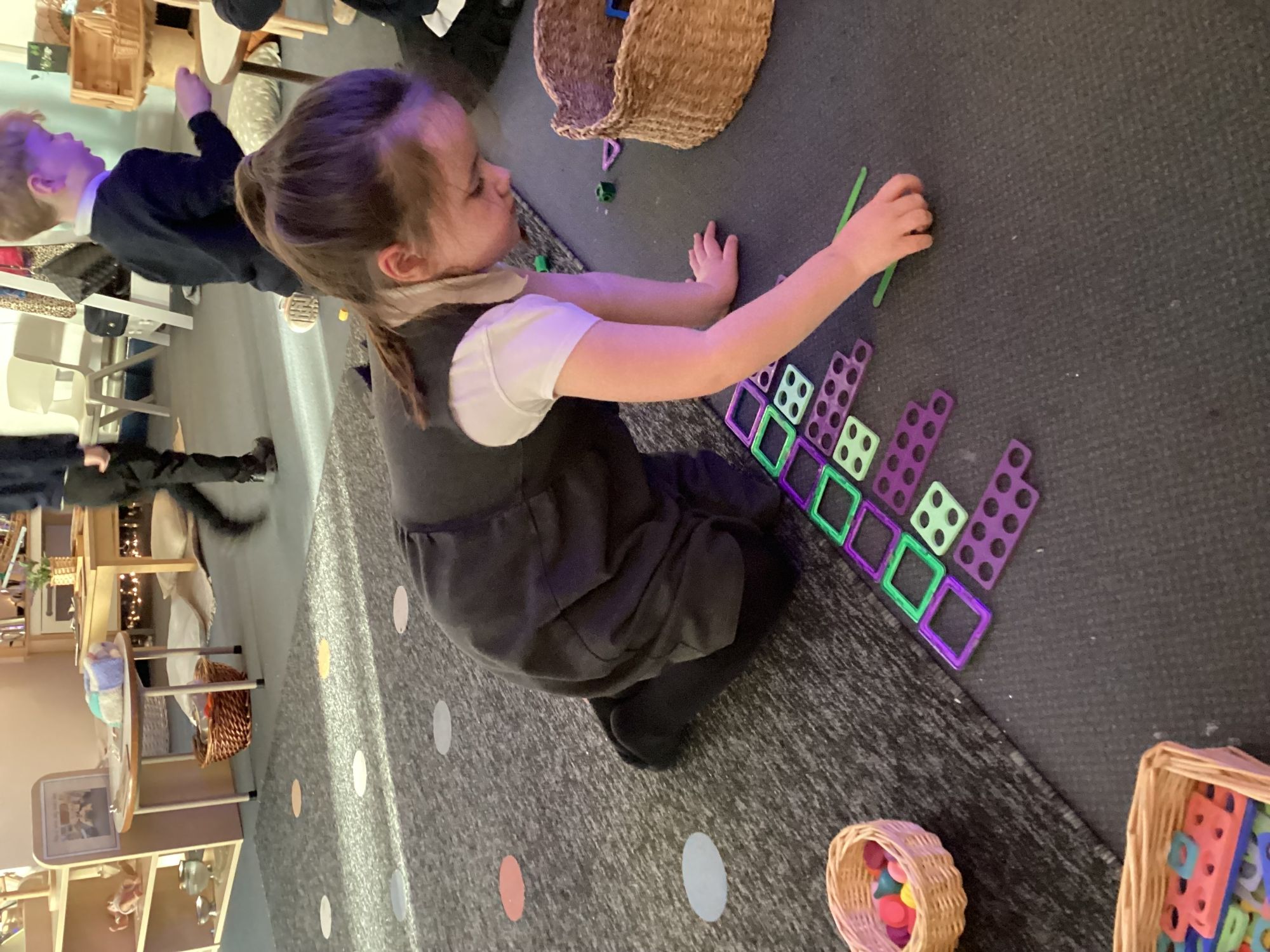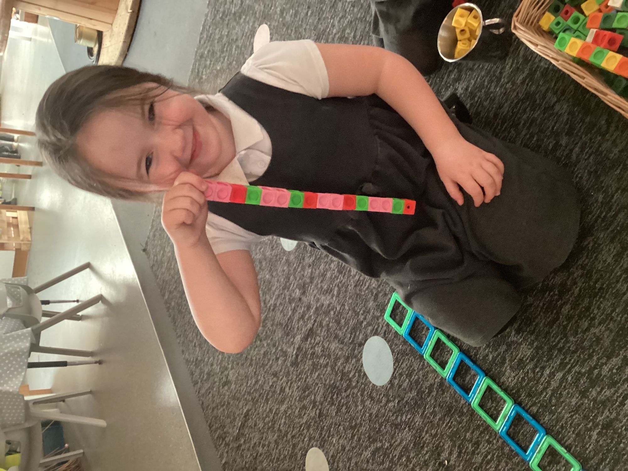 In maths, the children have loved using different resources to build patterns. Exploring and building patterns is an important part of learning in the Early Years. Through making patterns with objects, movements, sounds and colours, children begin to notice similarities, differences and what comes next. This helps to develop early mathematical thinking, problem-solving skills and logical reasoning.